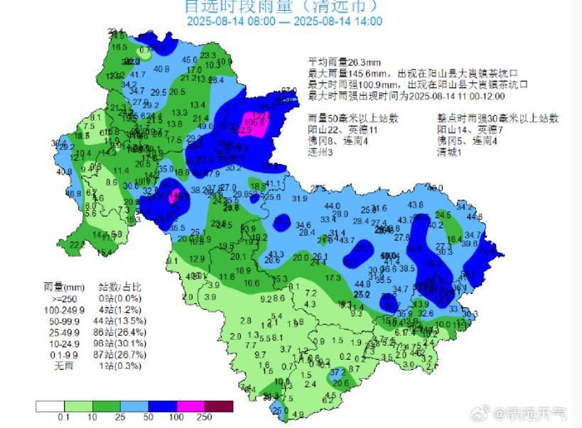 据@清远天气,8月14日08时到14时,我市阳山、英德、连州北部下了大雨到暴雨局部大暴雨,其余地区下了中雨局部大雨,全市平均雨量26.3毫米,大暴雨站点有4个(均出现在阳山):阳山县大崀镇茶坑口145.6毫米、阳山县秤架镇横梁桥村122.8毫米、阳山县秤架镇和平路105.8毫米、阳山秤架茅坪102.9毫米,最大时雨强出现在阳山县大崀镇茶坑口100.9毫米。